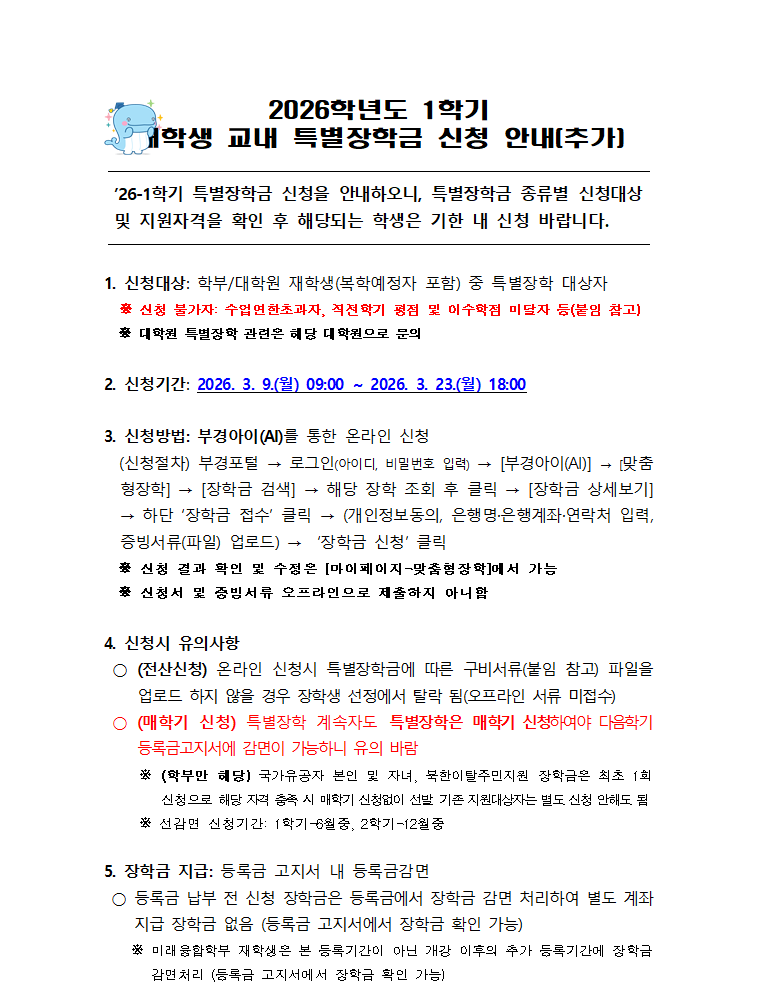 2026학년도 1학기 교내 특별장학금 추가 신청 안내